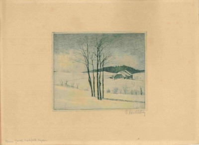 Paul Leschhorn, Bauernhaus Hochfeld Vogesen (Datum unbekannt) Es sind vor allem die Winter- und Vorfrühlingsstimmungen des Wasgenwaldes, die der Künstler verewigt hat. Sie lassen in Wahrheit die Würde und Größe der Natur ahnen und sind der reine Ausdruck seiner Innerlichkeit. Die Wiedergabe solcher in den allerfeinsten Tonwerten erlebten Landschaften setzen eine große Naturliebe voraus. Beim Malen mit Wasserfarben zeigte sich bald, dass sie im Frost des Mittelgebirges bald vereisten. Um der hemmenden Kristallbildung zuvorzukommen und das Abgleiten der Farben vom Malgrund zu verhindern, war der Aquarellist genötigt, entweder mit Spiritus oder mit Salzwasser zu arbeiten. An die Stelle des feinhaarigen Marderpinsels trat im Vogesenwinter der rauhere Borstenpinsel und den Metallbecher musste ein Holzbecher ersetzen. So konnten auf mühsamen Skiwanderungen nur mühsam Aquarelle vollendet werden und oft half sich Leschhorn mit rasch gezeichneten Bleistiftskizzen. Und doch entstanden, als Vorlage für seine Farbenholzschnitte kleine Winterwaldstudien in der Feinheit traumhafter Farbendichtung. Von den anstrengenden Schwierigkeiten dieser Malerfahrten kann sich der stille Betrachter der Farbendrucke kaum eine rechte Vorstellung machen. Trotz Frost und Raureif galt es auszuhalten und die überwältigenden Eindrücke bildhaft aus der erstarrten Natur herauszuholen. Oft konnten die kaum angedeuteten Winterbilder zuhause nur aus dem Farbengedächtnis wiederhergestellt werden, um als Aquarelle dem mehrplattigen Linoleumschnitt dienen zu können. Beim Genießen der Leschhornschen Schnittkunst vergessen wir aber alles, was an Selbstüberwindung und Technik in seinen Farbendrucken steckt, und lassen nur die Dringlichkeit, den Luftkreis und das reine Naturgefühl auf uns wirken Das Werkverfahren des Deutschen Farbenholzschnittes geht auf die seit Jahrhunderten in Ostasien verbreitete Volkskunst zurück und wurde von Prof. Emil Orlik übernommen. Die Kunst dieser Drucke beruht nicht auf dem Pressen, sondern auf der feinen Saugfähigkeit des feinen Japanpapiers, das es erlaubt, in vielfältigen Tönen nacheinander zu drucken. Erst der Wunsch, die Bilderauswahl zu erweitern, zwang Leschhorn zum Ausbau des Linolschitts, der von der Fläche ausging und deshalb für jede Überschneidung eine neue Platte beanspruchte. Für seine Handdrucke benützt der Meister selbst angeriebene Tempera- und Ölfarben, mit ihnen werden drei bis sieben Linolplatten kunstgerecht angepinselt und das saugende Japanpapier, in bestimmter Reihenfolge, sorgfältig auf sie gedruckt. Da für jedes Bild sämtliche Stöcke neu eingefärbt werden, ergeben sich bei der aquarellartigen Behandlung unvermeidliche Mischungsverschiedenheiten. Oft liebt es der Graphiker, aus seinen Platten neue Bildwirkungen herauszubringen, dann entstehen jene Tonarten feiner Schnittdrucke, die besonders von Kennern und Künstlern geschätzt wurden.